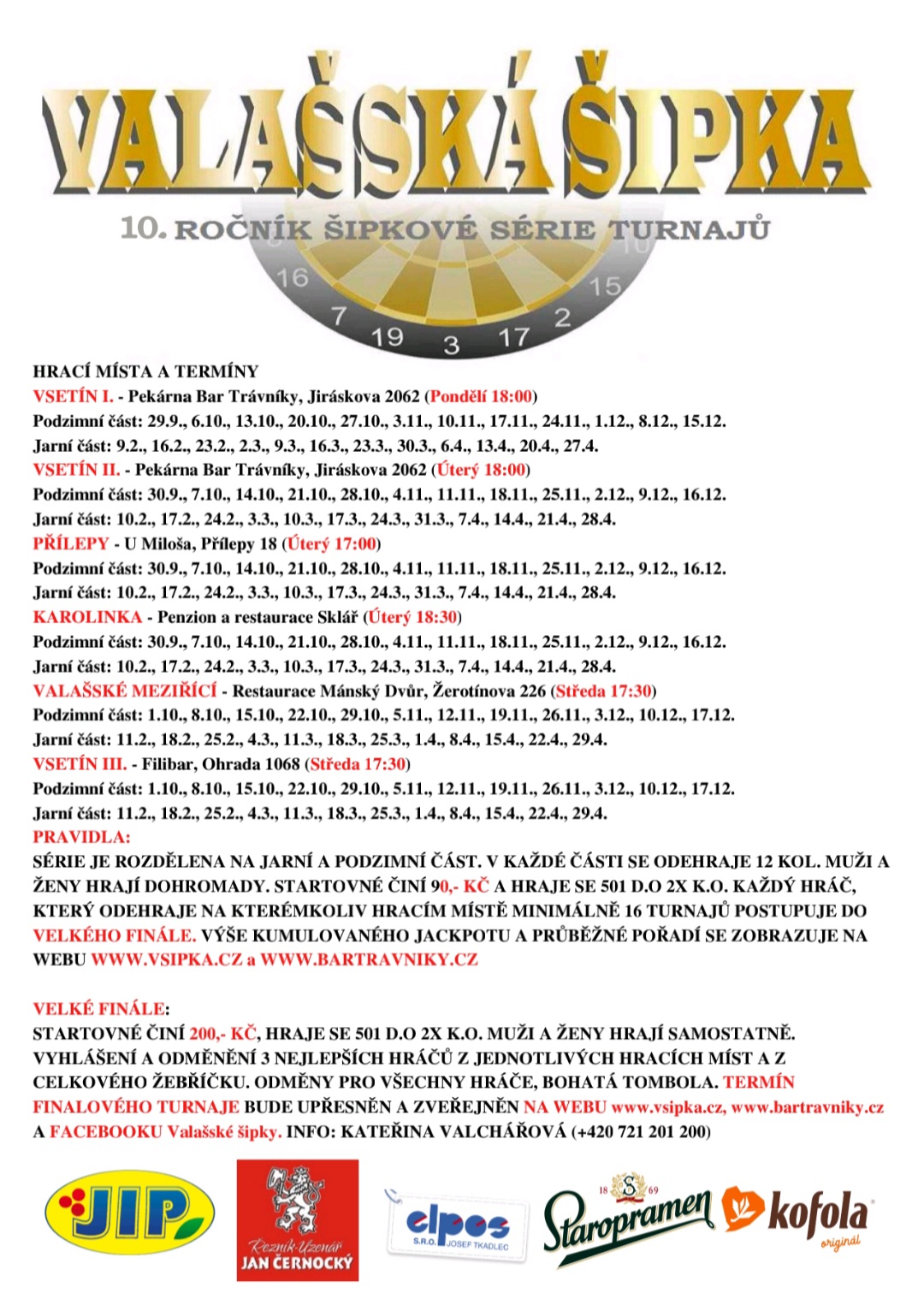 Finálový turnaj Valašské šipky se odehraje 22.12.2018 v Rockovém Clubu Beseda ve Vsetíně.